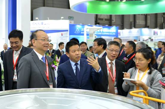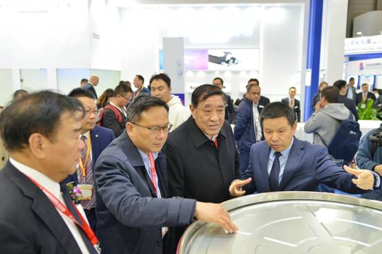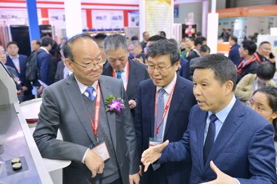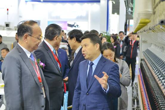 中國(guó)紡織工業(yè)聯(lián)合會(huì)黨委書記、秘書長(zhǎng)高勇(左1)聽取董事長(zhǎng)沈方勇介紹參展情況