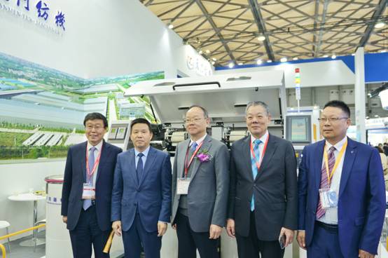 中國(guó)紡織機(jī)械協(xié)會(huì)會(huì)長(zhǎng)顧平(右2)、福建新華源董事長(zhǎng)陳宗立(左2)在天門紡機(jī)展位前合影