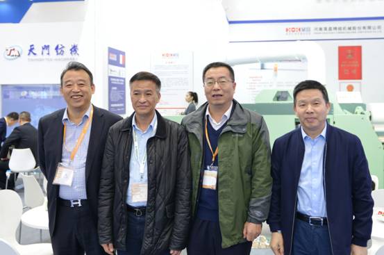中紡聯(lián)黨委書記、秘書長(zhǎng)高勇(左3)、中紡聯(lián)副會(huì)長(zhǎng)楊紀(jì)朝(右2)、中國(guó)紡織機(jī)械協(xié)會(huì)總工程師祝憲民(左1)在天門紡機(jī)展位上合影