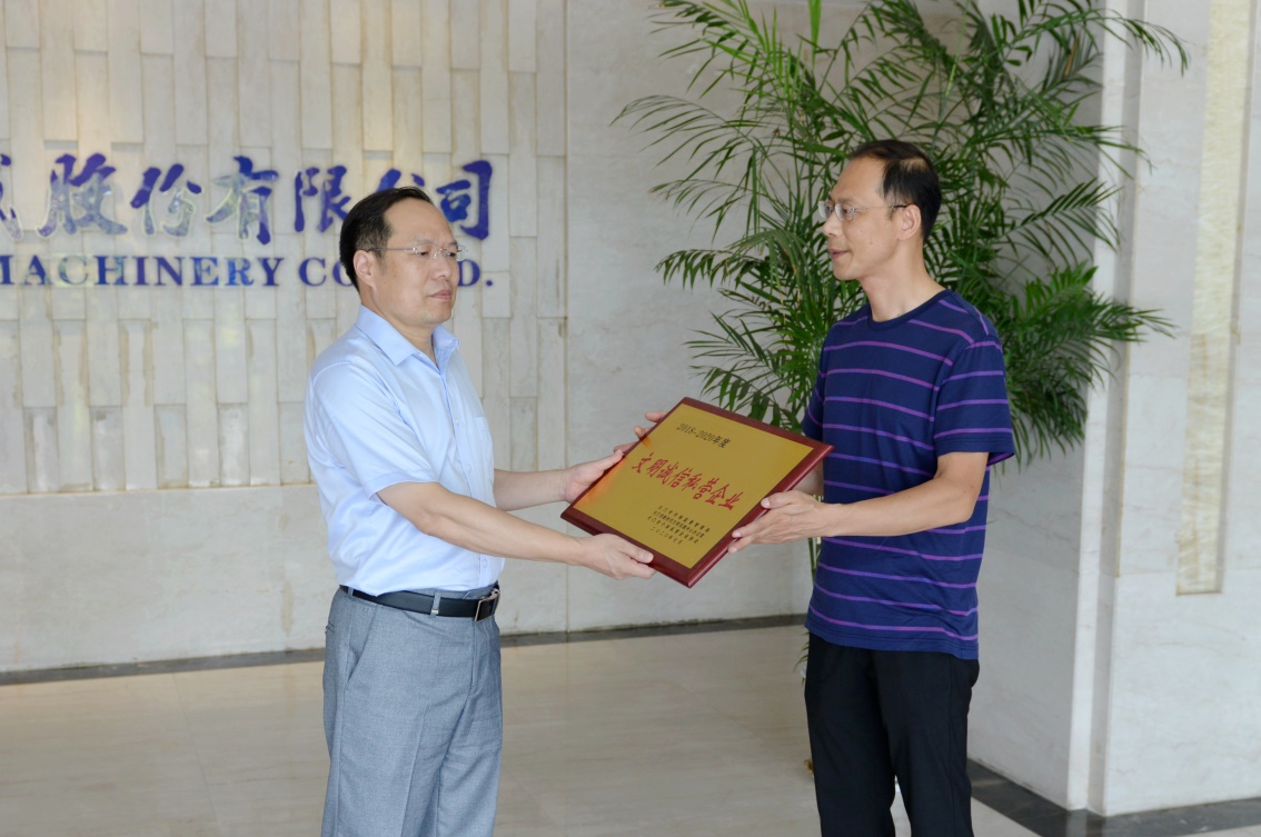 8月18日,天門市市場(chǎng)監(jiān)督管理局對(duì)天門紡機(jī)獲得的"文明誠(chéng)信私營(yíng)企業(yè) "榮譽(yù)進(jìn)行現(xiàn)場(chǎng)授牌,黨委書記魯?shù)挛拇砉窘优?。