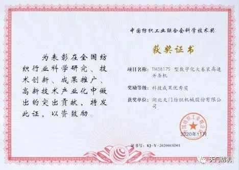 董事長代表公司獲評(píng)“2019中國紡織行業(yè)年度創(chuàng)新人物”。TM3817S型并條機(jī)獲評(píng)“紡織之光”2020年度中國紡織工業(yè)聯(lián)合會(huì)“科技成果優(yōu)秀獎(jiǎng)”。鄭強(qiáng)、楊家軒、黃必廣、郭升旗、徐紅、譚鵬飛、沈忱等7名研發(fā)人員獲得個(gè)人“科技成果優(yōu)秀獎(jiǎng)”。