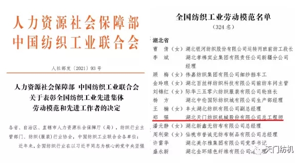 為表彰獎勵一批為國家紡織工業(yè)做出突出貢獻(xiàn)的先進(jìn)集體和個人,近日,人力資源社會保障部、中國紡織工業(yè)聯(lián)合會決定(人社部發(fā)【2021】93號文),表彰全國紡織工業(yè)先進(jìn)集體、勞動模范和先進(jìn)工作者,天門紡機(jī)總工程師鄭強(qiáng)被授予“全國紡織工業(yè)勞動模范”榮譽(yù)稱號。