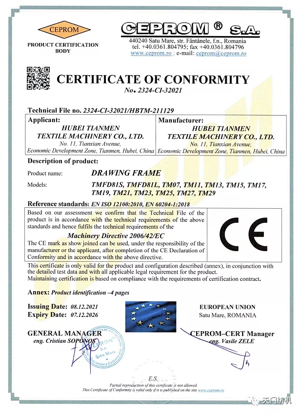 產(chǎn)品得到國際市場認(rèn)可,天門紡機獲得歐盟“CE”證書
