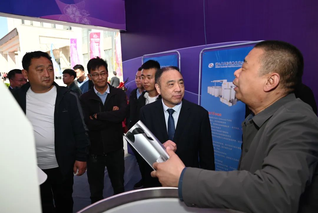 天門(mén)紡機(jī)總經(jīng)理焦倫進(jìn)向蒞臨公司展位的晉州市長(zhǎng)王林(右2)、中國(guó)服裝協(xié)會(huì)常務(wù)副會(huì)長(zhǎng)楊金純(右1)、晉州市紡織服裝行業(yè)協(xié)會(huì)會(huì)長(zhǎng)李永強(qiáng)(左1)介紹公司與晉州紡織企業(yè)合作情況