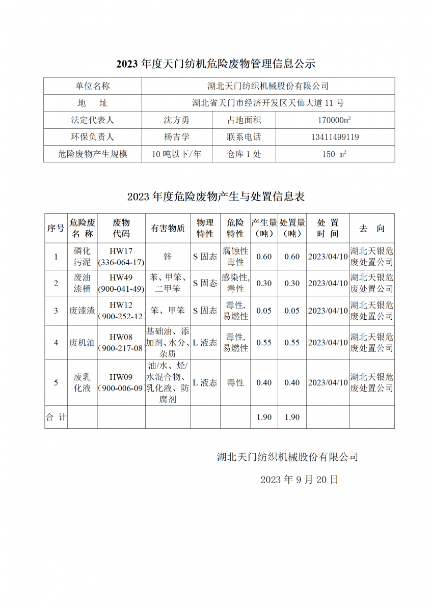 2023年度天門紡機(jī)危險廢物管理信息公示