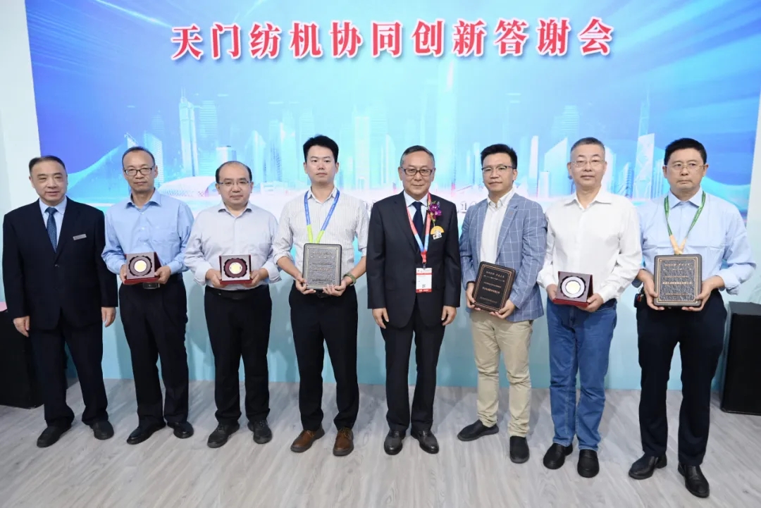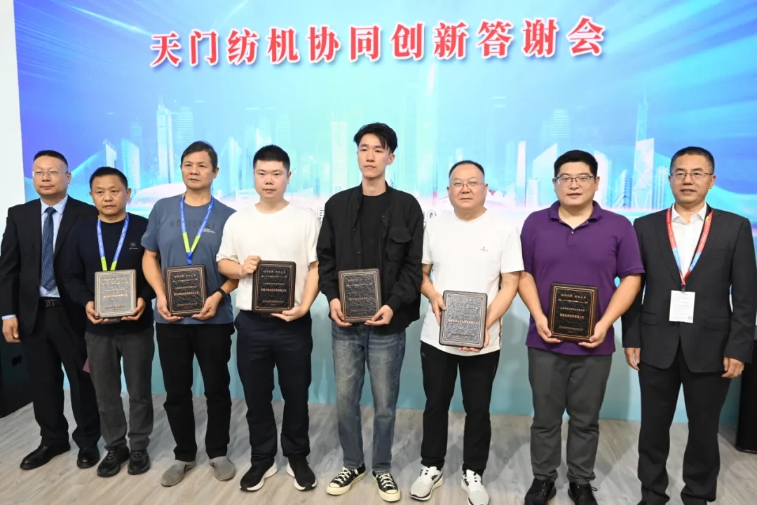 天門紡機總經(jīng)理焦倫進宣布在協(xié)同創(chuàng)新中作出突出貢獻的單位和個人名單,中國紡織工業(yè)聯(lián)合會徐迎新副會長為倪俊龍董事長、陳冰教授、曹中華博士、陸惠文先生頒發(fā)紀念章,為臺達、匯川、南通五洲等3家企業(yè)代表頒發(fā)紀念牌。