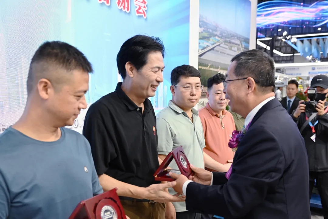 天門紡機副總經(jīng)理肖少華宣布為在并條新技術(shù)、新產(chǎn)品示范應(yīng)用上作出突出貢獻的華茂集團、魏橋紡織、魯泰紡織等45家企業(yè)名單,中國棉紡織行業(yè)協(xié)會董奎勇會長為這些企業(yè)代表頒發(fā)紀念牌。
